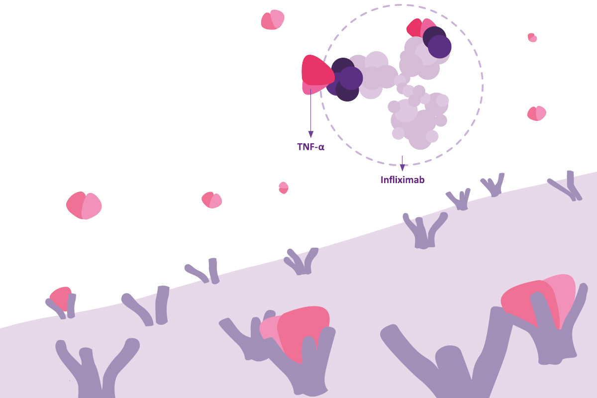 Infliximab is a monoclonal antibody that recognises and binds to tumour necrosis factor alpha (TNF-α), which is present at increased levels in some inflammatory diseases. By blocking TNF-alpha, infliximab reduces inflammation.